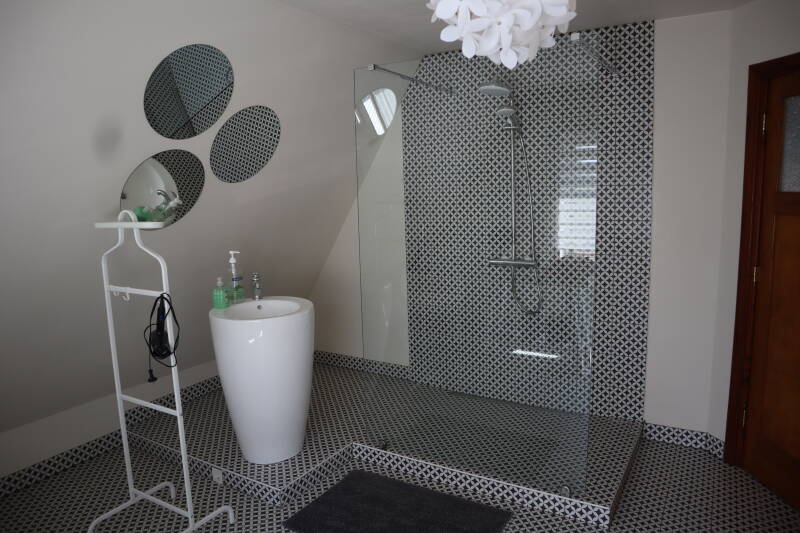 De badkamer is heel ruim, met een grote inloop douche. Handdoeken, shampoo en haardroger zijn aanwezig.